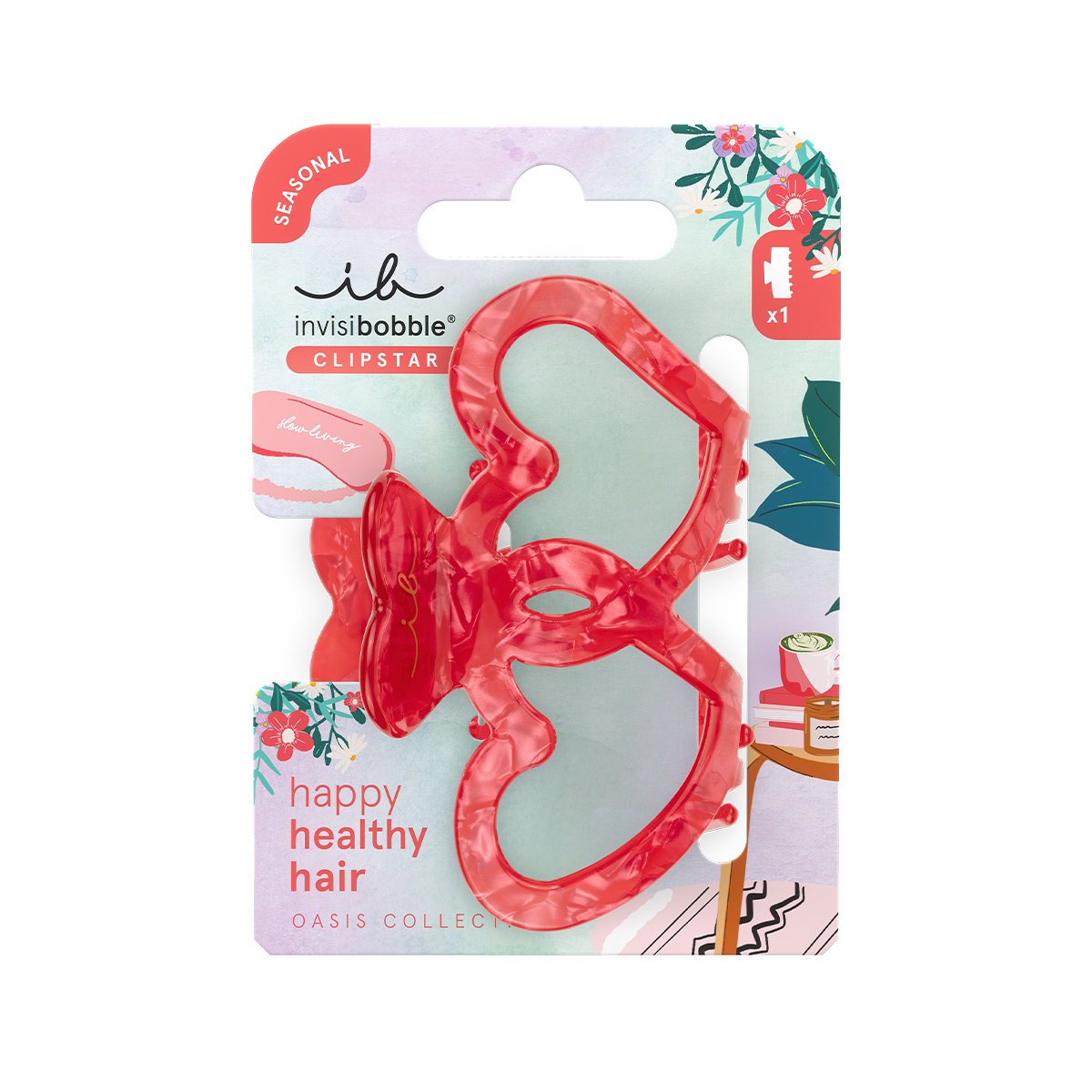Оазис может стать настоящим любовным гнездышком. invisibobble CLIPSTAR Oasis Lovers Nest – элегантная заколочка для волос в форме двух красных сердец, сплетенных вместе, с перламутровым блеском. Крабик позволяет завершить образ всего за несколько секунд: пара движений – и прическа готова! Заколка надежно при этом бережно фиксирует волосы в прическе в течение всего дня. Подходит для любых образов. Рекомендована для густых и кудрявых волос.